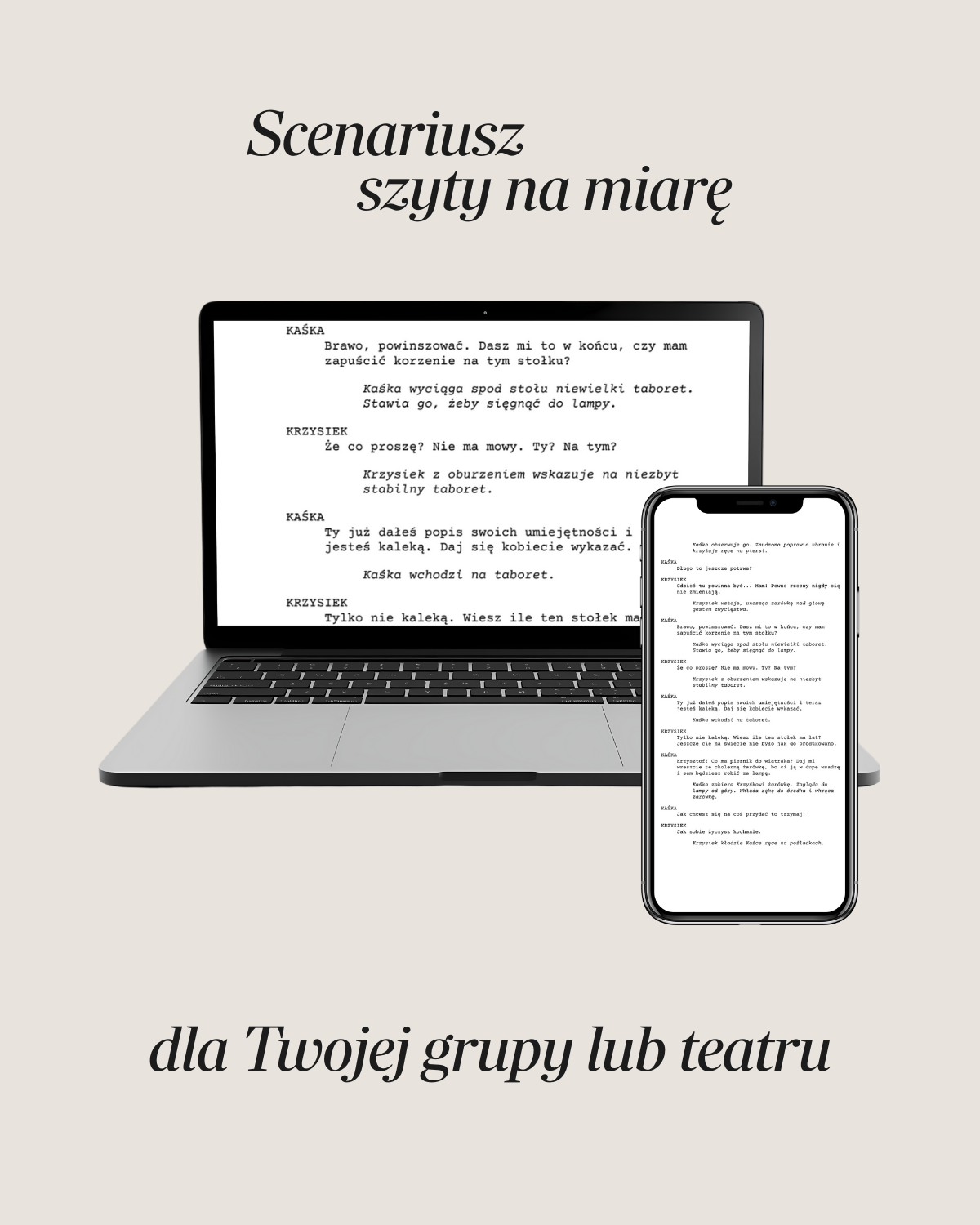 Tworzę autorskie scenariusze teatralne i musicalowe szyte na miarę, dopasowane do Waszych realnych potrzeb i możliwości zespołu. Wspólnie ustalamy liczbę aktorów, stopień trudności ról, czas trwania spektaklu, a także zakres angażu aktorskiego. Scenariusz może powstać zarówno na konkretny temat, jak i od zera — w oparciu o Waszą wizję. Możecie też zdać się w stu procentach na mnie!